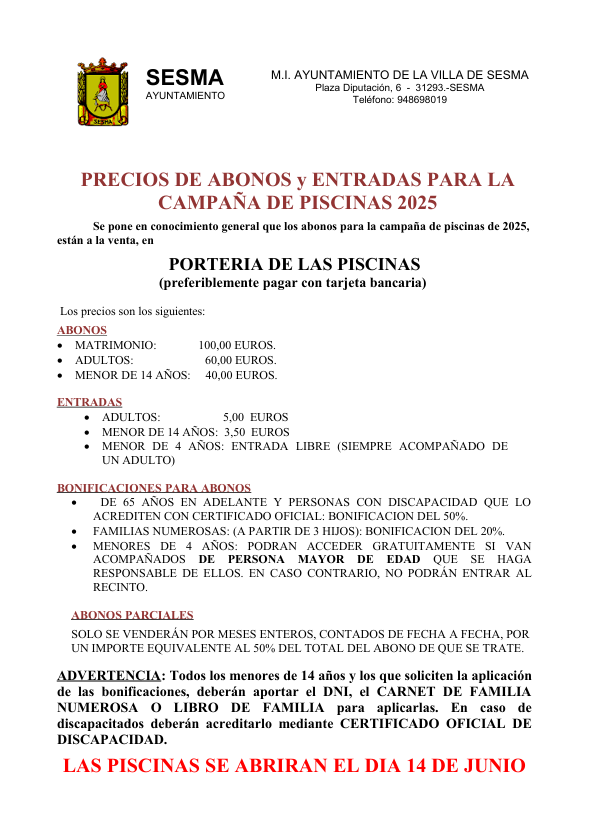 Los abonos están a la venta en la portería de las piscinas (preferiblemente con pago por tarjeta).